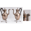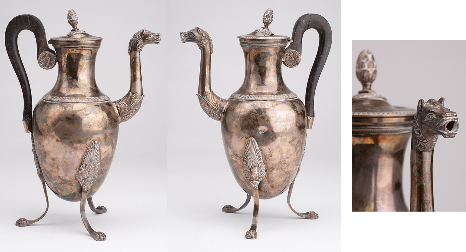 A large tripod silver jug (cofee pot), beak with dragon head and chiseled melted pattern, blackened wood handle (restored), three guarantee punches (Janus, Vieillard and Minerva) - France early nineteenth time. Height 29 cm to the seed, weight 700 g. Seed to restore, a small shock to the body.
