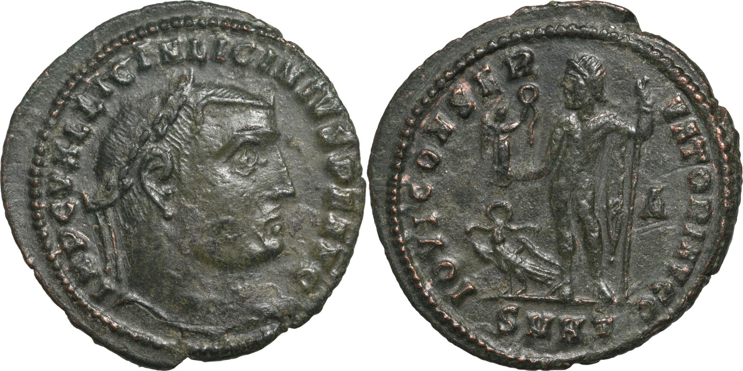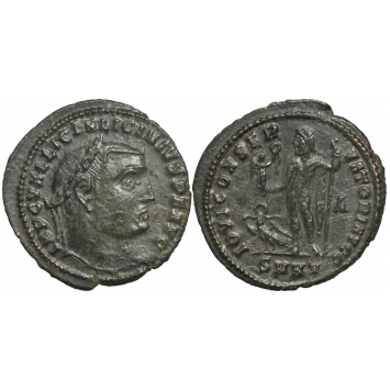 IMP C VAL LICIN LICINIVS P F AVG, laureate head to right / IOVI CONSERVATORI AVGG, Jupiter standing to left, holding Victory on globe and leaning on sceptre, at feet, eagle standing to left, head to right, with wreath in beak, A in right field, SMHT in exergue. RIC VI 73. XF