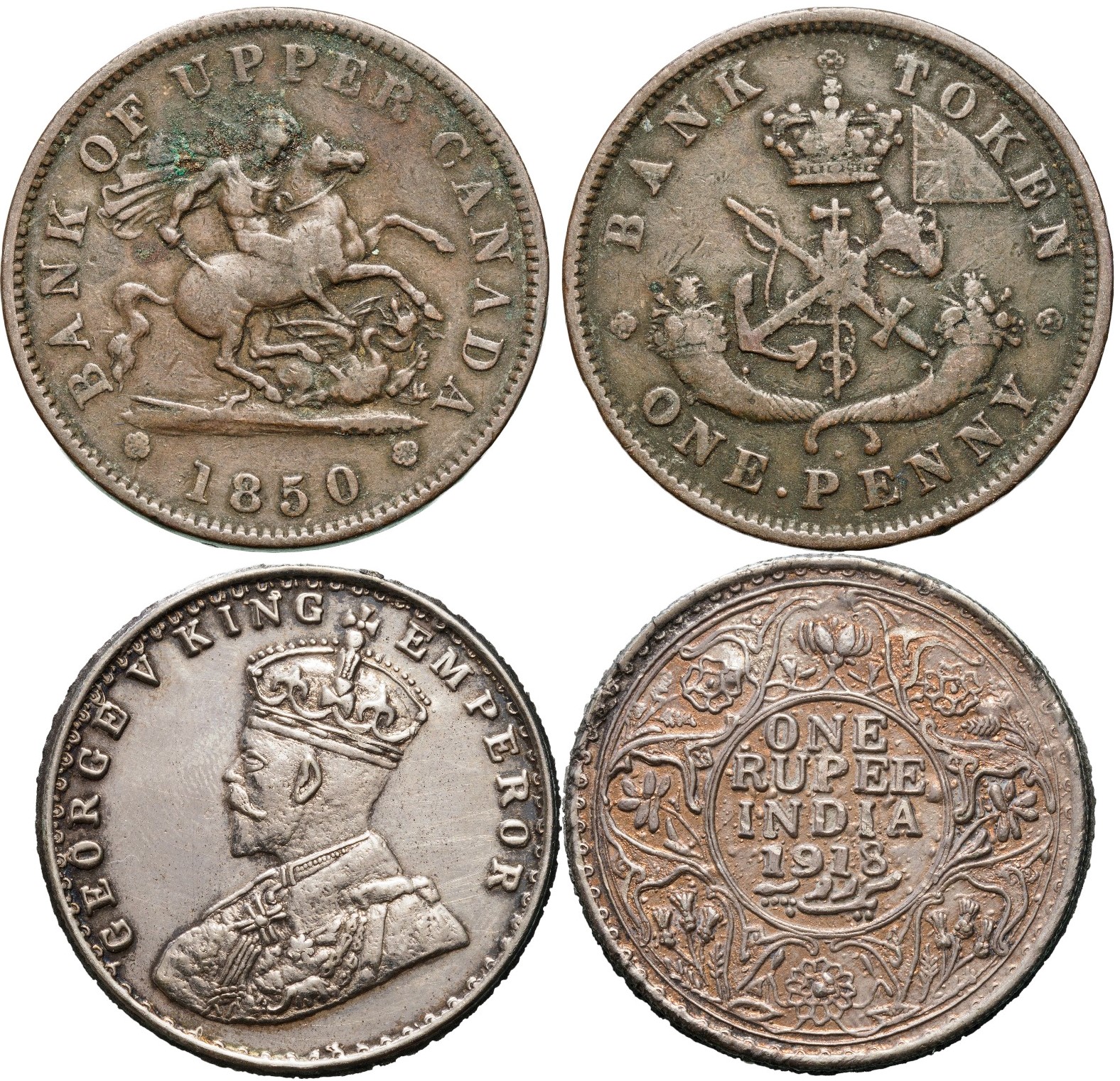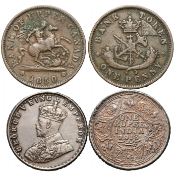 SKU: 297 Auction has finished. Total bids: 0INDIAGeorge V (1910-1936) Rupee 1918, Calcutta mint. Silver, 11 g.; Bank of Upper Canada, 1 Penny Token 1850, copper. XF-VF+ (2) Shop ID: 60_80Auction LXIX