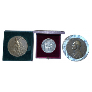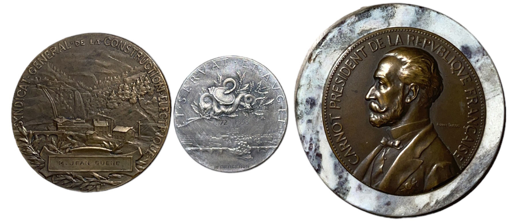 Sadi Carnot, President (1887-1894). Medal by Alphonse Dubois, 1889, Bronze, 68 mm, on marble stand (90 x 15 mm); 3rd Republic (1870-1940) AGENTS DE CHANGE DE PARIS Medal 1898, Silver (50 mm, 63.29 g), engraved "M. Bergeron" in original case of issue with recipient`s name on the lid; Prize Medal from the Electrical Constructions Syndicate N.D, Signed by Charles Pittet, Bronze (69 mm, 126.58 g), engraved for "M. Jean Guene" two in original cases of issue. UNC, interesting lot! (3)
