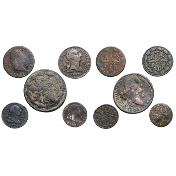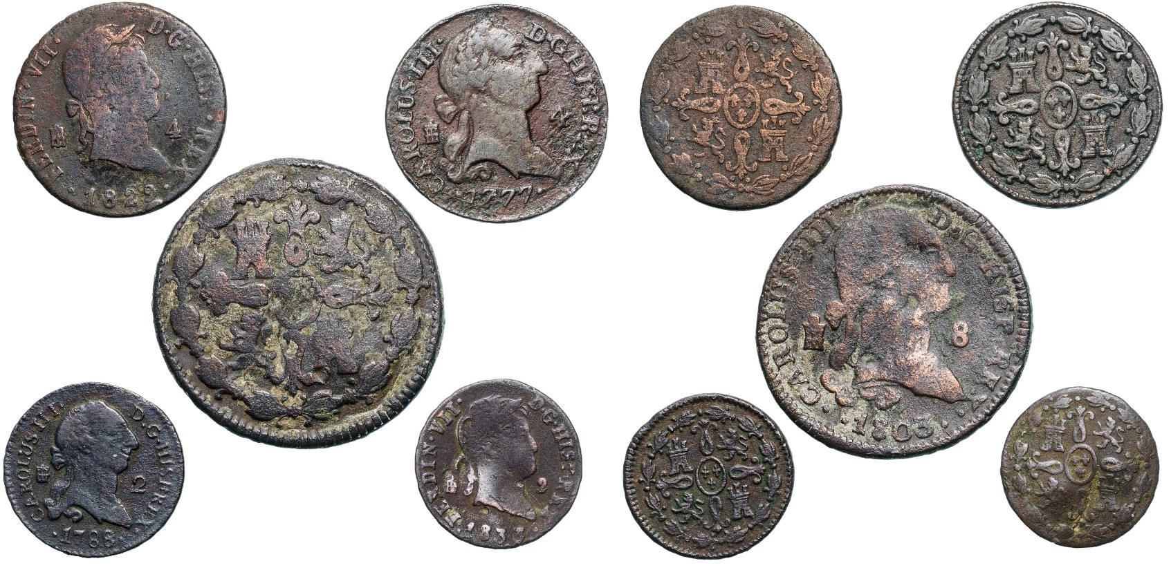 Charles III (1759-1788) 2 Maravedis, Segovia mint; 4 Maravedis 1777, Segovia mint; Charles IV (1788-1808) 8 Maravedis 1803; Ferdinand VII (1808-1833); 4 Maravedis 1777, Segovia mint; 2 Maravedis 1833, Segovia mint. VF (5)