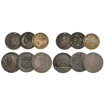 Halfpenny The Guernesey Mines 1788, Leeds Halfpenny 1793, City of Poole Halfpenny 1795, Memorial Medal to George IV, 1830; Coronation of George IV 1821 (holed), Jeton 1862. F-XF, interesting lot! (6)