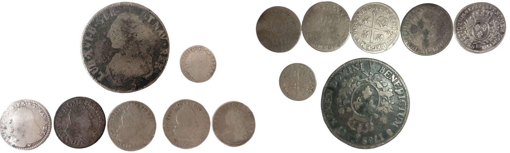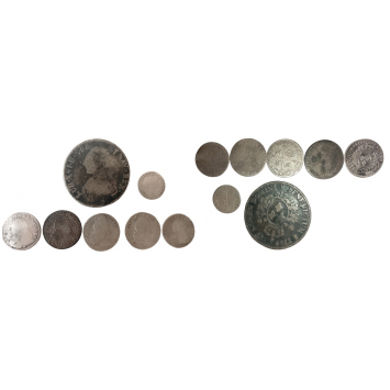 10 Sols 1702 BB (Silver, 2.08 g); 10 Sols 1703 A (Silver, 2.96 g); 5 Sols 1704 BB (Silver, 1.24 g); 10 Sols 1707 AA (Silver, 2.77 g); 1/10 Ecu 1726 A, Silver, 2.77 g.; 12 Sols 1727 BB (Silver, 2,68 g); Ecu 1789 (Period Counterfeit, 25.20 g). (7) VF, interesting lot!