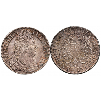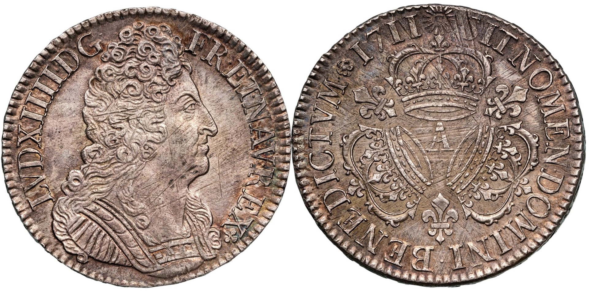 Silver, 30,52 g., 41 mm., LVD. XIIII. D. G. - FR. ET. NAV. REX / SIT. NOMEN. DOMINI. BENEDICTVM (Mm) 1711, G.229 - Dr.378 - Dy.1568. XF, a superb coin with mint luster and cabinet patina!
