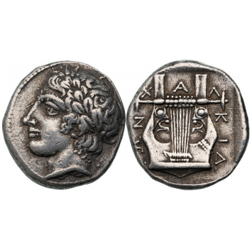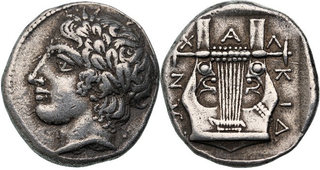Silver, 14.44 g., 25 mm. Laureate head of Apollo left / Χ-A-Λ-KIΔ-EΩN, kithara within incuse square. Robinson & Clement Group H, 22 var. (A-/P19), unlisted obverse die! A superb coin, impressive portrait, dark patina!.From an European collection before 2005. XF RR!
