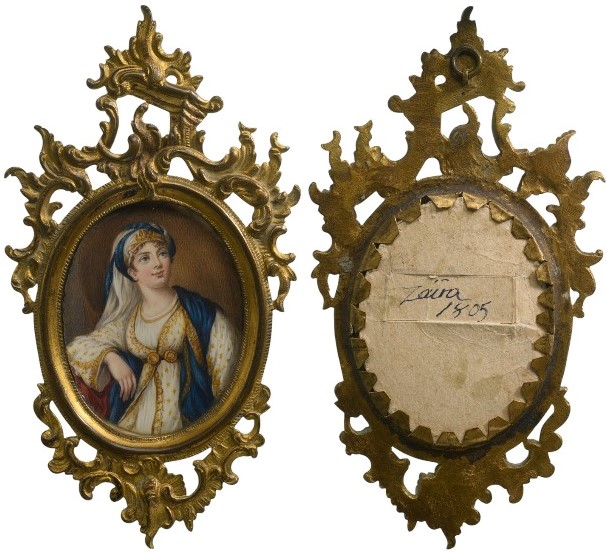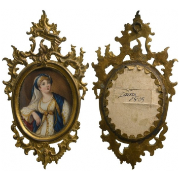 Painted after the famous, larger portrait of the famous Italian singer, by E. Viget Lebrun (where the velvet robe is red); 180x99 mm., the cardboard fixed to the reverse, bears an old, handwritten label with “Zaira 1805” (the date when Grassini was on stage in London to sing in von Winter’s opera, when probably she met the Duke of Wellington for the first time, in its original, fire-gilt, rococo frame with suspension ring to the upper reverse.