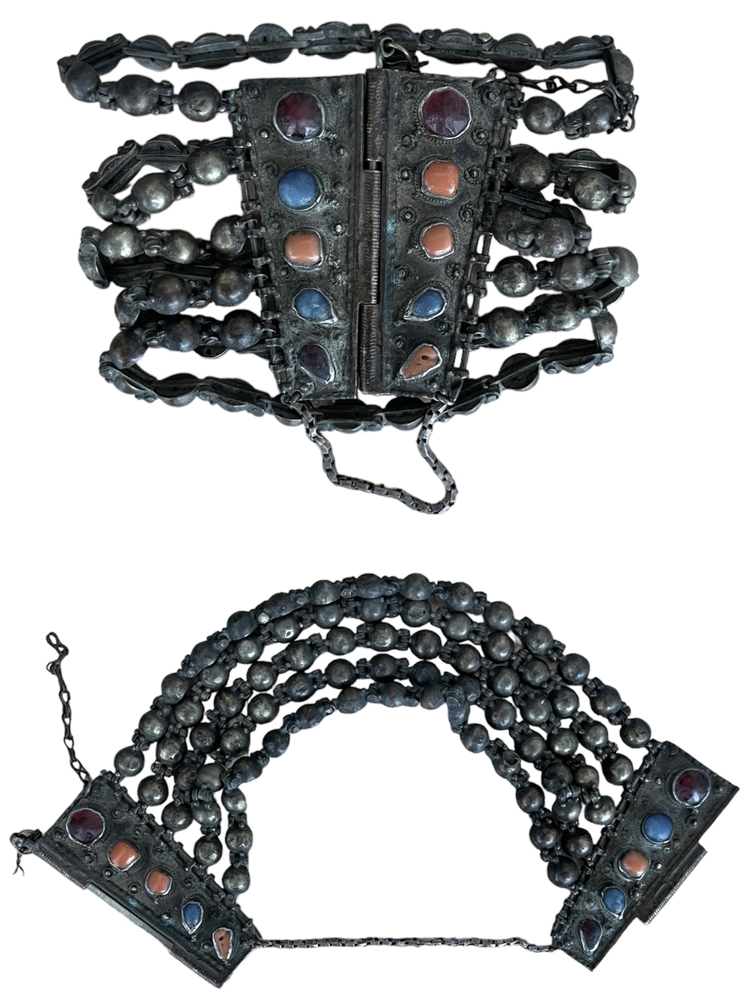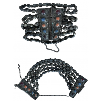 Beautiful old oriental ankle bracelet composed of five rows of articulated Silver bell beads, amounts decorated with colored stones, pull-rod clasp. Traditional 19th century work probably from North Africa, probably Berber. Dimensions 13 x 5 cm, weight 66 g. Good general condition, minor dents visible. II