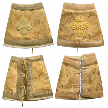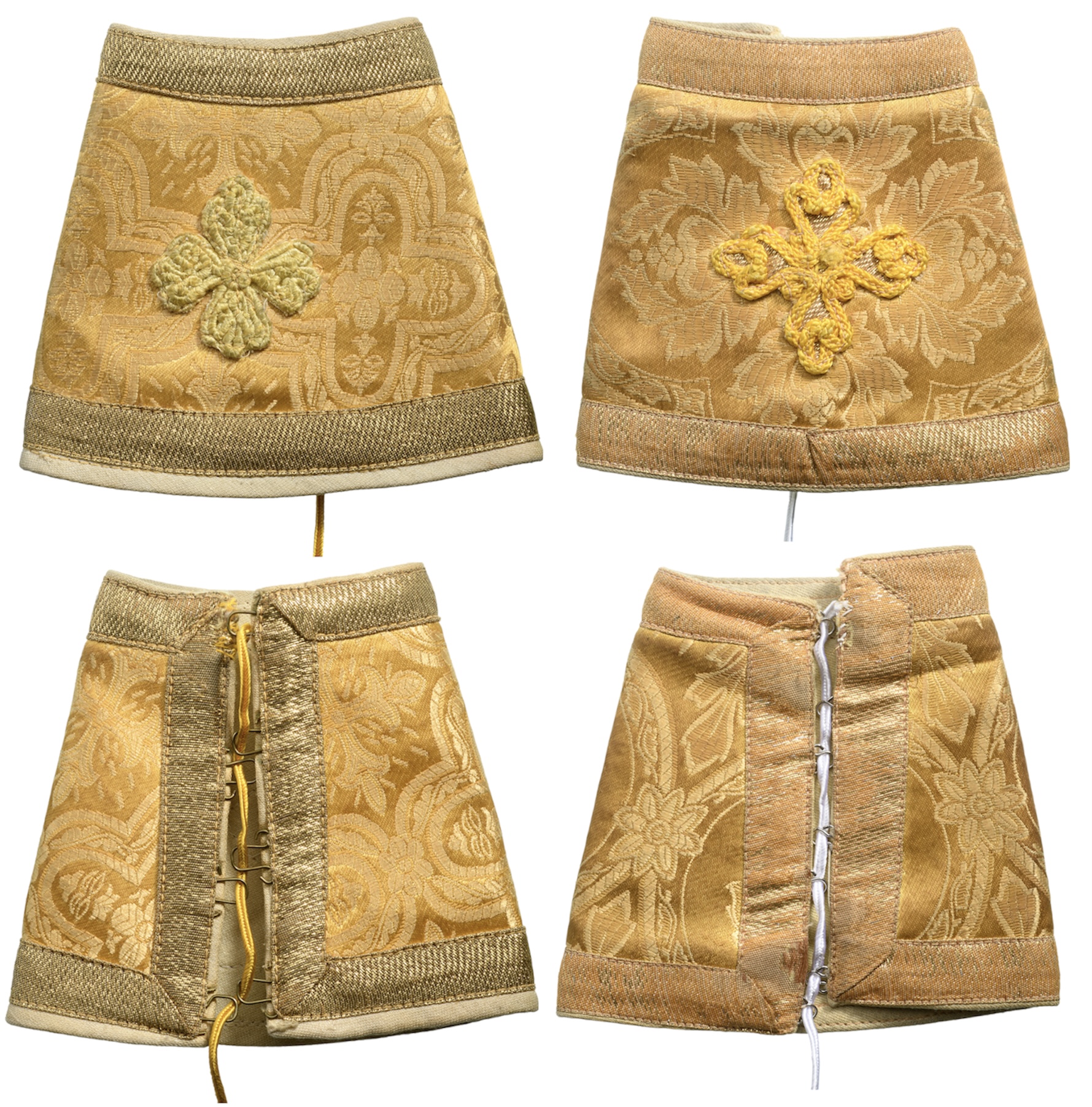 Pair of Orthodox Liturgical fabric cuffs (Epimanikia) made out of golden-cloth embroidered with a gold thread design, crosses at the center. In very good condition.