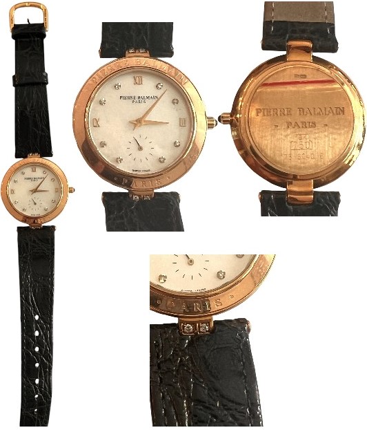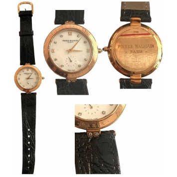 Pierre Balmain ladies wrist watch, 34 mm, 18k GOLD case, 21.7 g., white dial with diamonds, leather strap with four diamonds, quartz mouvement. In very good condition.
