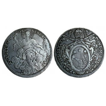 Silver, 26,34 g., 42 mm., PIUS SEXTUS - PONT · M · A · VI Tiara and crossed keys over shield / AUXILIUM - DE - SANCTO - 1780 Personification of the Catholic Church seated on cloud. Berman 2958. Muntoni 18. VF+, a coin with cabinet patina!