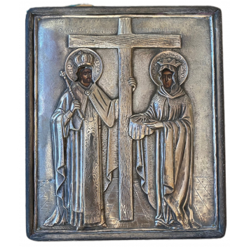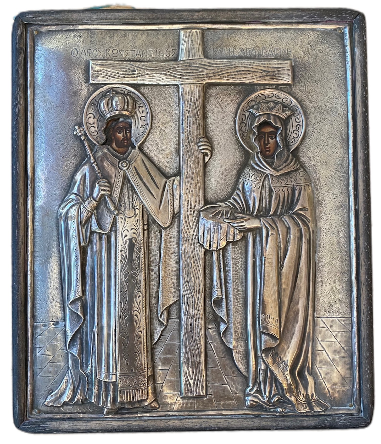 Polychrome rectangular icon on panel, faces painted visible under oklad in silver, representation in pageantry of the Emperor Constantine and Helena his mother holding the Latin cross discovered by the Empress. Relief decoration. Guarantee stamp, Greek work of Byzantine tradition from the mid-twentieth century. Good condition, dimensions 26 x 22 cm.