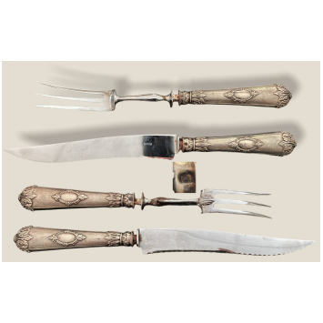 Serving cutlery in filled silver and steel, serrated knife and fork with movable edge, handles with homogeneous decoration finely engraved with a guilloche background, feather appliques, mude cartridges. Minerve guarantee mark (925/1000), France around 1900, length 32 & 28 cm., 260.1 g (total weight). Good condition.