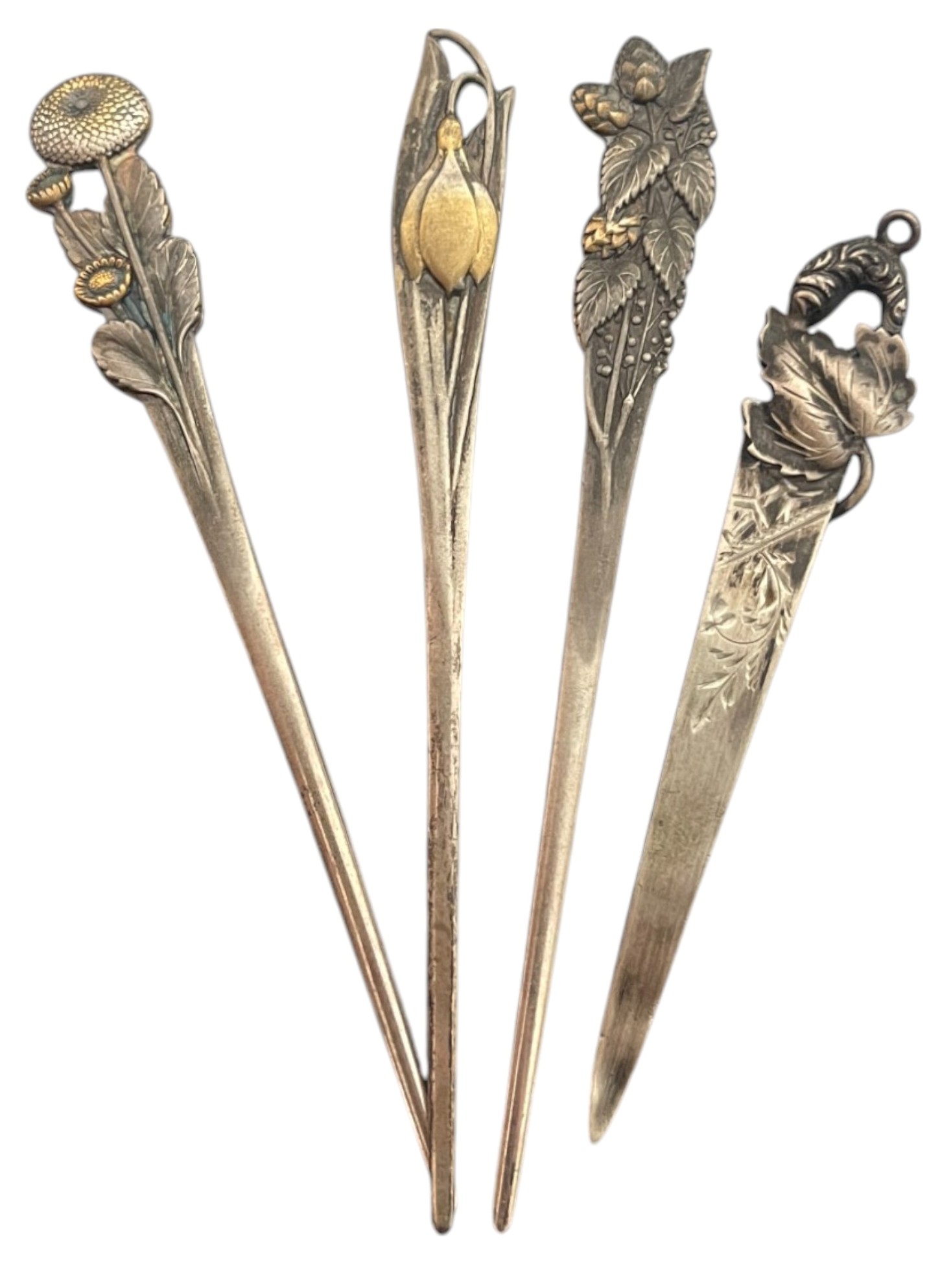 Set of 4 cocktail cair pins. 3 x WAKO Japan decorated Silver pins, dim.: 10,2 cm, 1 x decorated hair pin, dim.: 8,4 cm. Total weight: 22.15 g. Very fine condition!