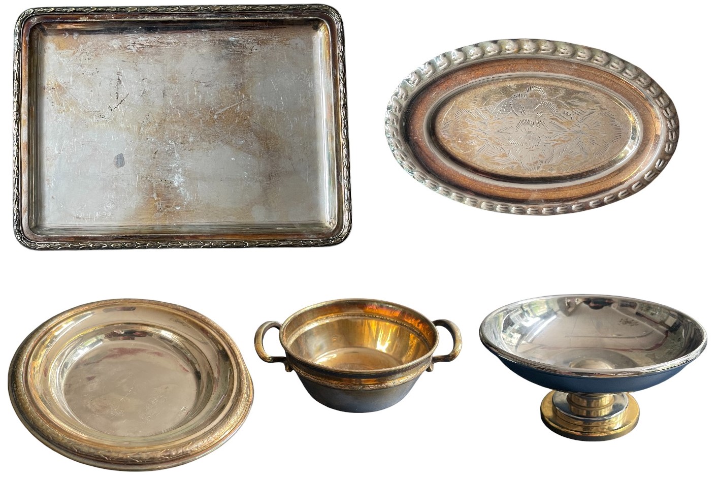 1: Large tray in silvered Metal with decorated borders, marked "M. PLAT", in fair condition. Dimensions: 27,5x20,5 cm. 2: Round silvered tray with decorated border, marked "M", the border slightly bent. Dimension: 13.8 cm. 3: Decorated silvered oval tray with flower motifs, maked "E.P.N.S", overal good condition. Dimensions: 16.8x12 cm. 4: Small silvered fruit bowl with handles and decorated exteriour band, marked "M", in good condition. Dimension: 10x4,2 cm. 5: Stainless steel fruit or desert cup with solid gilt metal foot, in perfect condition. Dimensions: 12.4x6.5 cm. (5)