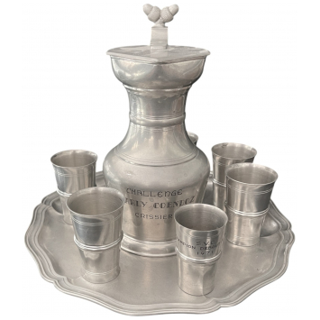 Set of 7 elements comprising: 1. Tin water or milk jug with decorated handle, incribed "Challenge Charly Coendoz, Crissier" and the names of the contestants. Dim.: 19,5 x 12 cm. 2. Set of 5 tin tumblers, one inscribed "S.V.C CHAMPION DEBOUT 300 M 1971", maker's mark "SIGG, Frauenfeld". Dim.: 8 x 5,3 cm. 3. Tin serving tray, marker's mark "SIGG, Frauenfeld". Dim.: 30,3 cm. Perfect condition! (7)