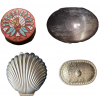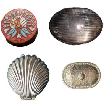1: Metal like shell form pill box. Dimensions: 4.9x4.4 cm. Perfect condition. 2: Oval silvered metal pill box eith hammered lid, marked "HECHO A MANO". Dimentions: 3.6x2.2 cm. Very good condition! (2)