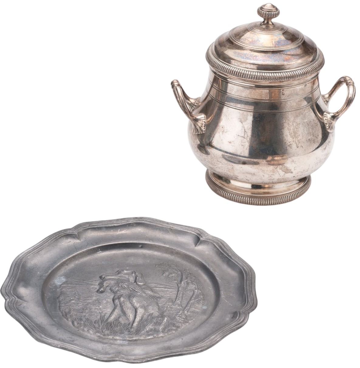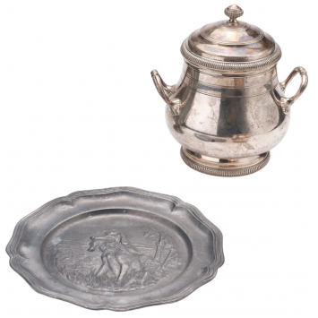 2 / Pewter decorative plate embossed with a hunting scene. Diameter 17 cm, circa 1950.
