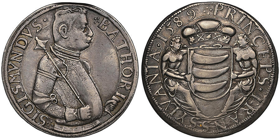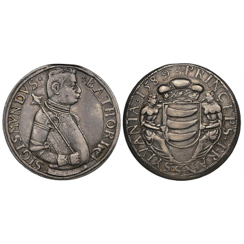 Silver, 28.7 g., SIGISMVNDVS. .BATHORI armoured bust right / PRINCEPS.TRANSSYLVANIÆ.1589 weapon hold by two angels. Resch 38, Dav. 8802A. Extremely rare, VF+, superb patina!