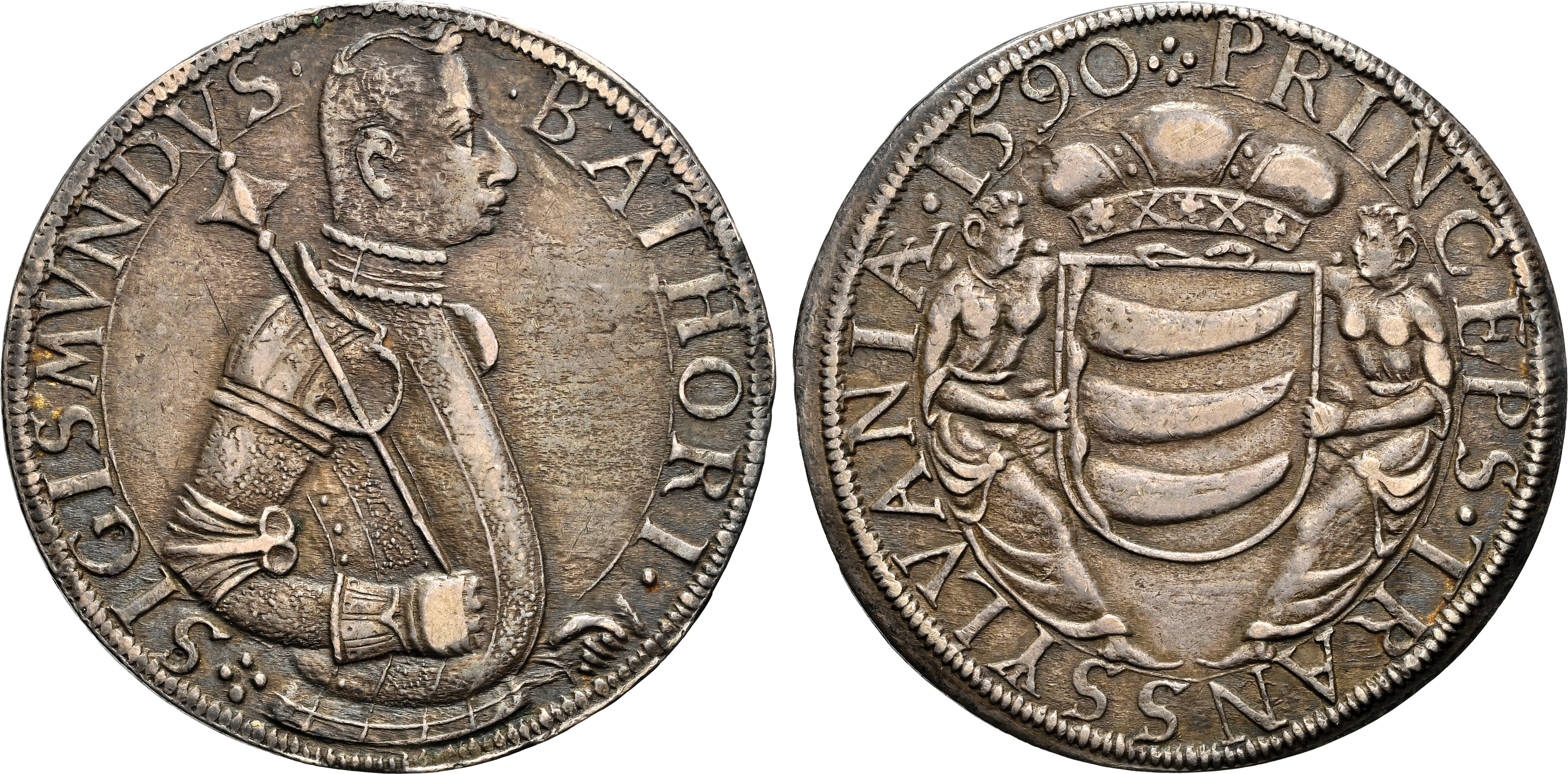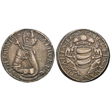 Silver, SIGISMVNDVS. .BATHORI armoured bust right / PRINCEPS.TRANSSYLVANIÆ.1590 weapon hold by two angels. Resch 82 var., Dav. 8802A. NGC XF 45, superb patina!