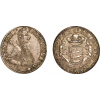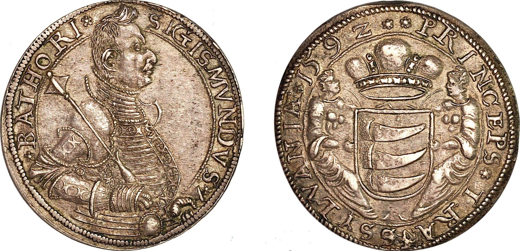 Silver, 29.26 g., SIGISMVNDVS. .BATHORI armoured bust right / PRINCEPS.TRANSSYLVANIÆ.1592 weapon hold by two angels. Resch 113., Dav. 8803. Old cabinet toning with much lustre! Rare! NGC AU 58! R!