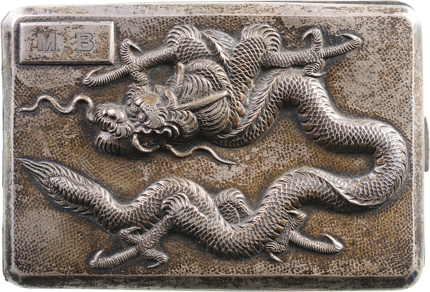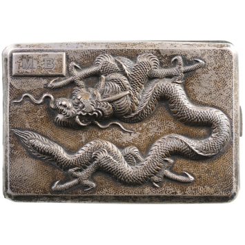 Of curved shape to better fit in a pocket, the lid embossed with a dragon and a rectangular plate engraved with the initials "M.B.", matted and gilt inner compartment, struck with the "STERLING" mark. An interesting piece, from the period of the international mission of 1900-1901 during the Boxer rebellion. Extremely fine condition, nice patina. Dim.: 80,0 x 110,5 mm. I R!