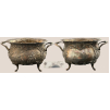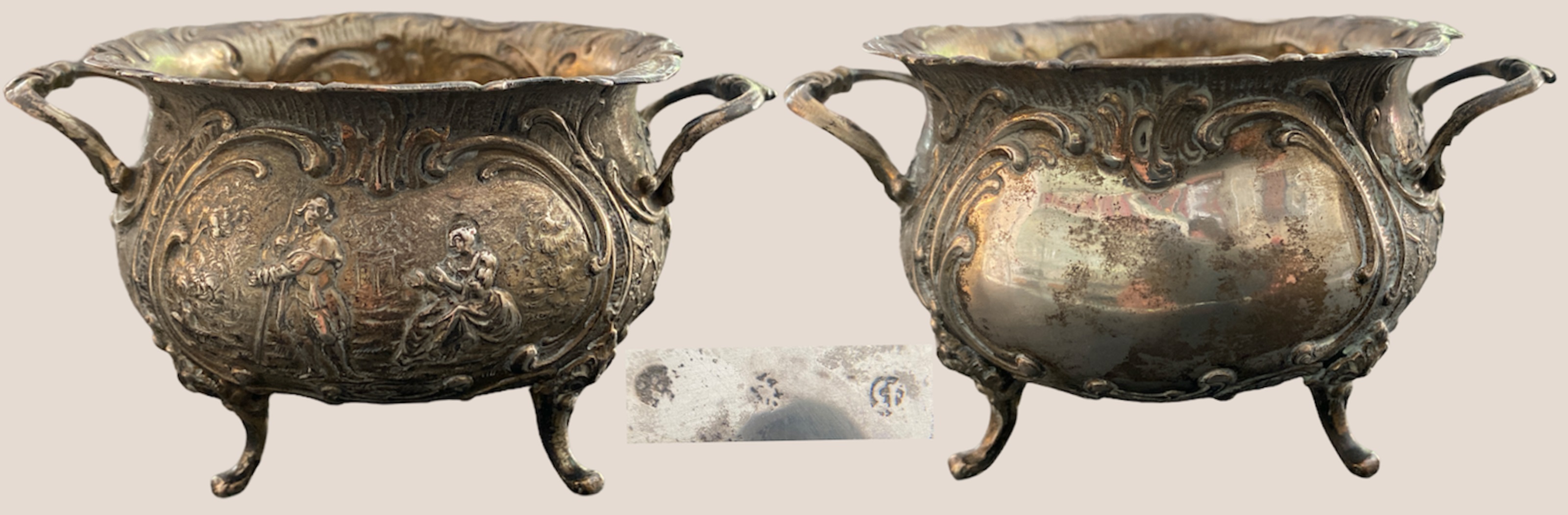 Silver cookie jar, quadripod model with two handles, rounded body carved with a mute cartouche decorated with volutes, "marquise-marquise" genre scene, flowered sides. Hallmarks to be identified, probably Italian work in the mid-twentieth century. Weight 184 g, diameter 9,5 cm. Good condition.
