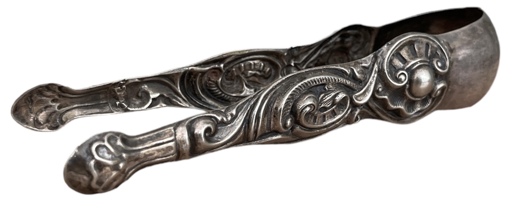 Silver sugar tongs, so-called "Bordelais" model with applied foliage decoration. Late 19th century. Dimension 18 x 3 cm, weight 42 g. Extremely fine condition. I