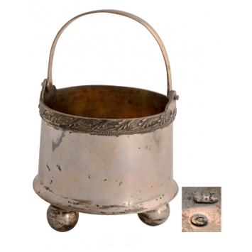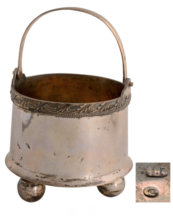 Three balls feet, right body, frieze with ferns engraved in border, height 7.5 cm, weight 220 g, no mark except "84" standard guarantee, "swan" stamp for export.