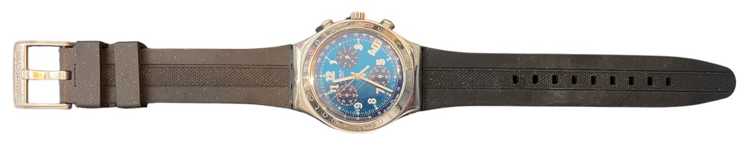 SKU: 979 Auction has finished. Total bids: 0BRACELET WATCHES, POCKET WATCHES, CLOCKS - SWITZERLANDMen's Swatch Irony, Stainless Steel, with rubber band in good working order. Superb condition and highly collectible! Shop ID: CH 3Auction LXIX