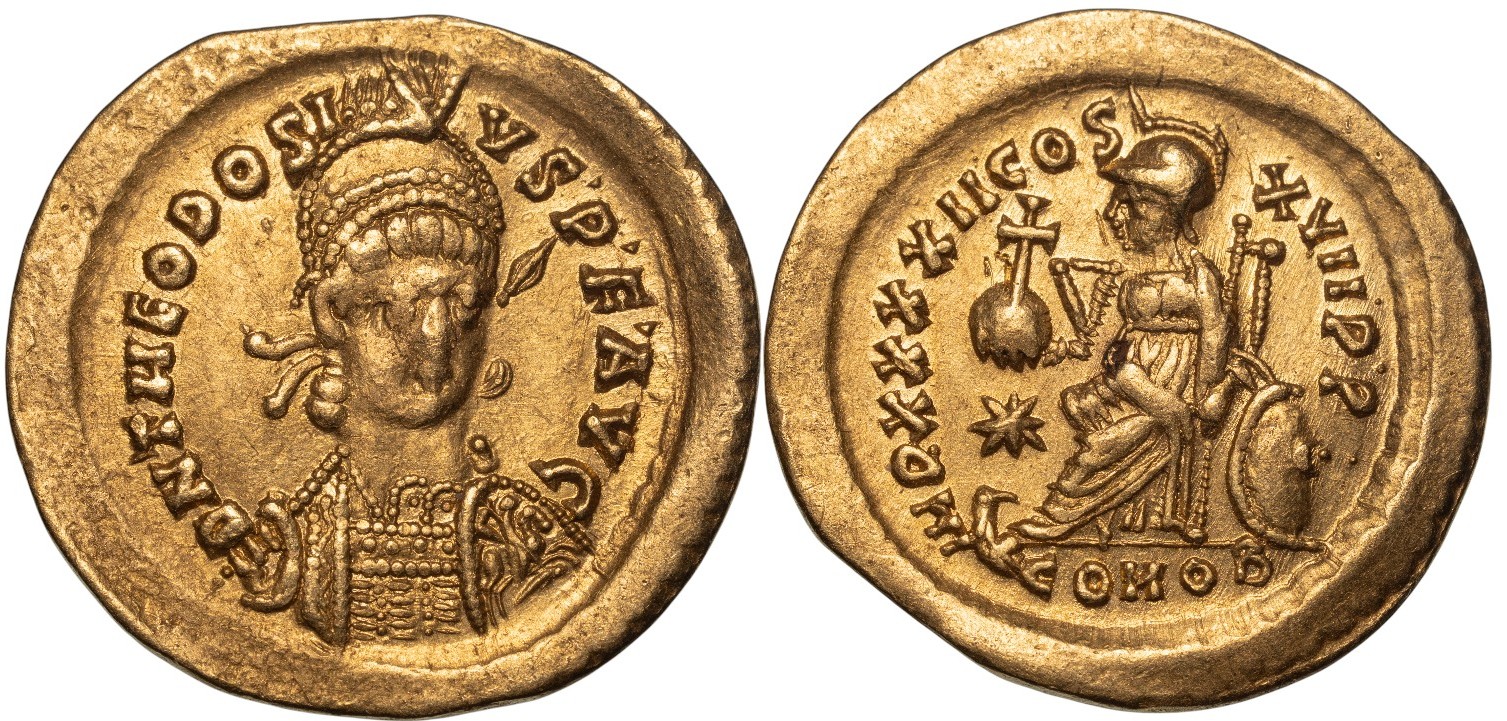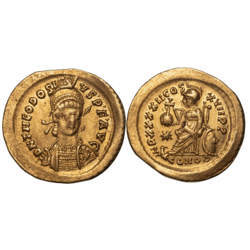 Pearl diademed helmeted and cuirassed facing bust of Theodosius II, head turn slightly right, spear in right hand over shoulder, shield decorated with horseman motif in left / Constantinopolis enthroned left, globus cruciger in right; grounded shield at side, star in left field. COMOB in exergue. RIC X 293; Depeyrot 84/1. Superb Mint State, as struck! FDC!