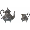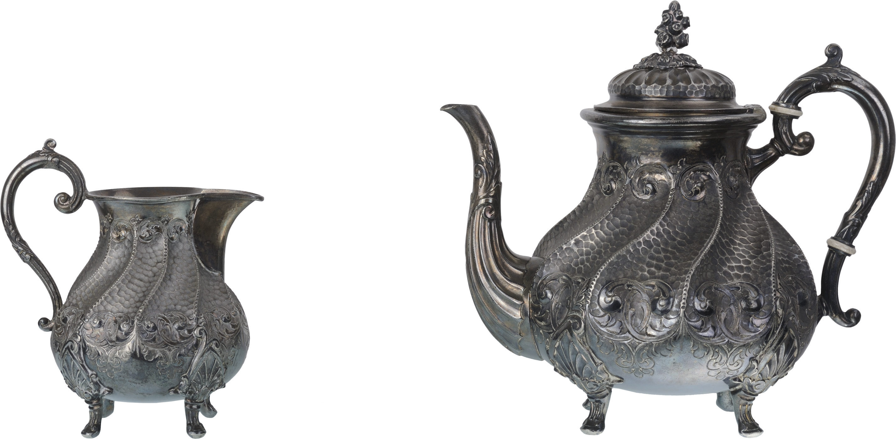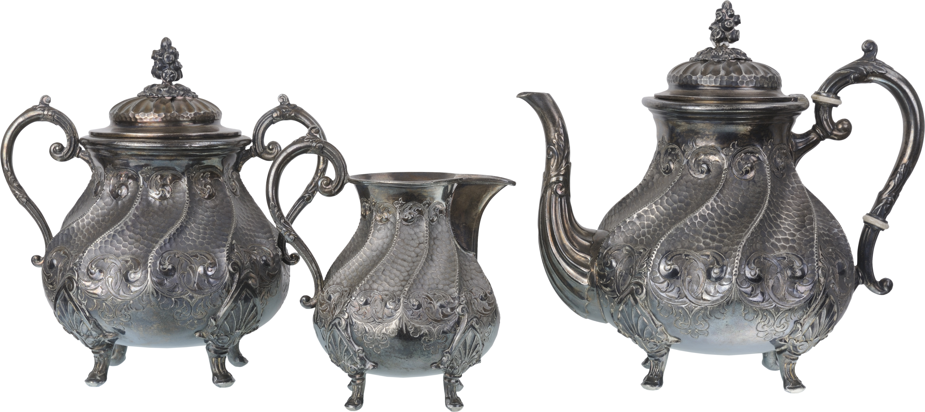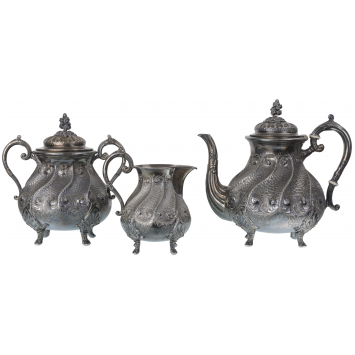 Three-piece set consisting of a large coffee maker, a covered sugar bowl and a milk jug. Low-grade silver and amalgam tin and copper, beautiful homogeneous pattern with twisted ribs on a "bat" wings background, decorative volutes, foliated body and handles, feet skates, neo-gothic style, period work from the end of the 19th century in the Austro-Hungarian sphere. Respective height 20, 19 and 13 cm, indicative weight 1500 g for the whole. Respective height 20, 19 and 13 cm, indicative weight 1500 g for the whole. Presence of many punches. A superb set in extremely fine condition.