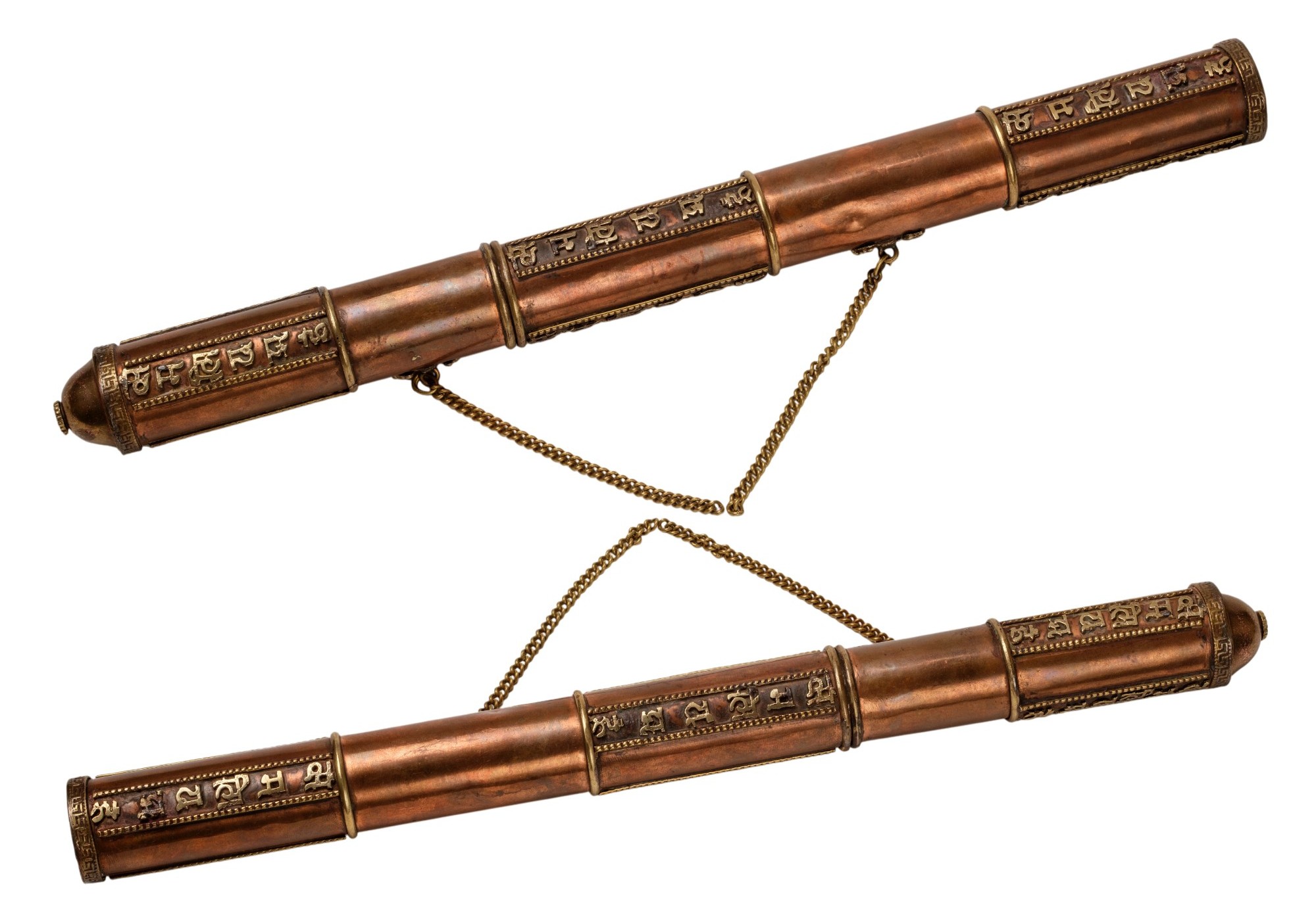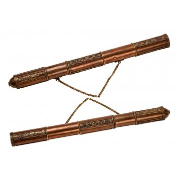 Traditional Tibetan flag tube in polished copper, enhanced with Brahmic motifs and writings in relief on three sections. The two parts are joined by a chain, a ruby-colored bead at the end on the button. Object of popular religious culture throughout the Himalayan arc. Period beginning of 19th century. Good general condition. Dimensions 38 x 3,5 cm. Very interesting object!