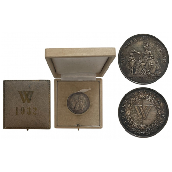 Signed by J C Merikofer. Silver (31 mm, 15.16 g) VIRTUS INNEXA VERO around central W rev. Minerva and student, AUT PUER AUT NUMQUAM, original case of issue wirth date "1932" on the lid. Leu 1450. UNC!