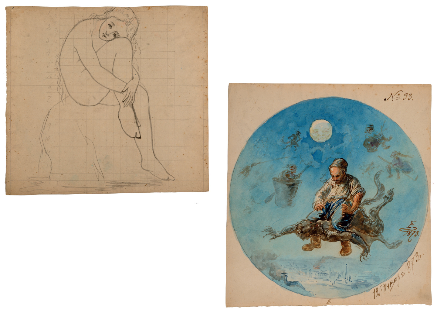 Circular view representing "Farmer riding on the devil in the sky", subject of a popular tale, monogram "E" of Nikolai Ludwigowitch Ellert on January 12th, 1873. The famous composer Tchaikovsky created in Moscow (supervisor Nicolas Rubinstein) symphony no. 2 "Little Russia" on January 26th, 1873, based on Ukrainian folk tales. Ellert was stage draftsman in charge of decorations of Imperial Opera in Moscow and likely produced this preparatory watercolor for this occasion. Sheet in good condition, dimensions 44.5x41.5 cm.