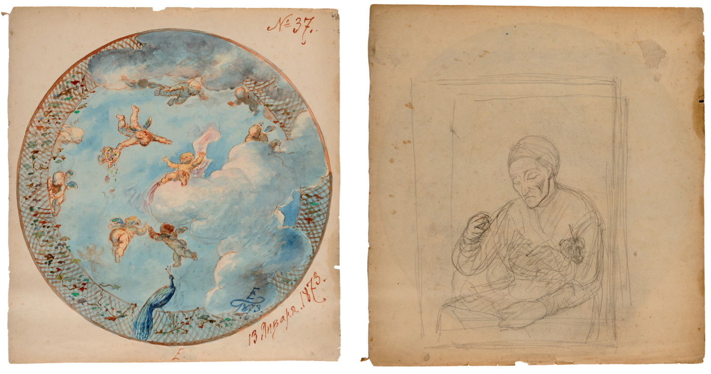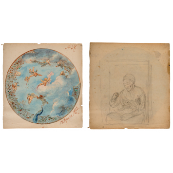 Circular view representing a project for ceiling decoration "Angels in clouds" and a pencil sketch on the back, monogram "E" of Nikolai Ludwigowitch Ellert on January 13th, 1873. The famous composer Tchaikovsky created in Moscow (supervisor Nicolas Rubinstein) symphony no. 2 "Little Russia" on January 26th, 1873, based on Ukrainian folk tales. Ellert was stage draftsman in charge of decorations of Imperial Opera in Moscow and likely produced this preparatory watercolor for this occasion. Sheet in good condition, dimensions 44.5x41.5 cm.