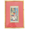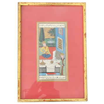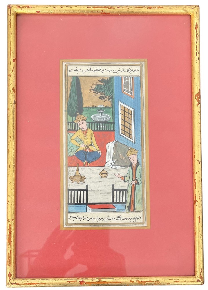 Watercolor on fine paper, architectural representation of a Persian prince in tunic and headdress seated in front of a collation, his wife standing at his side, the scene opening outside onto a wooded garden with a fountain. A simple vision of the provincial art of living, an invitation to share. Frame outlines. Two writing cartouches at the top and bottom. Good condition, polychrome tones preserved. Eastern Persia, 20th century work. Dimensions 21 x 30.5 cm. Frame under glass, unopened. Superb and very attractive!