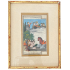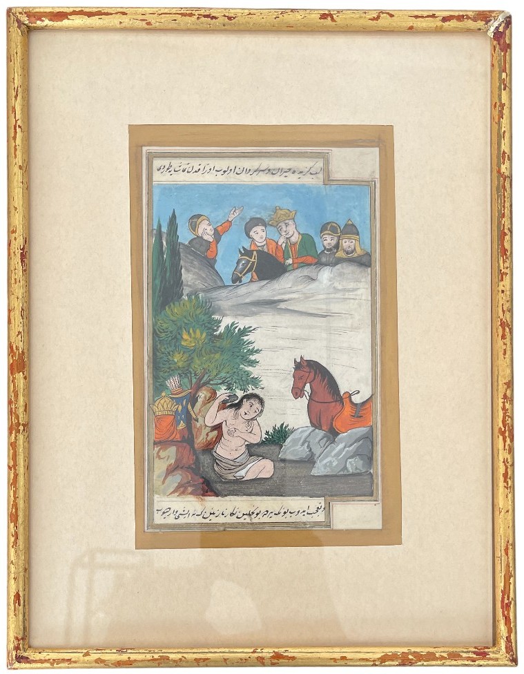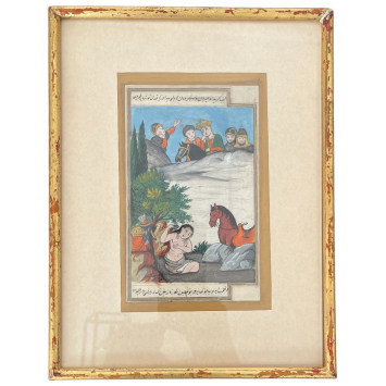 Watercolor on fine paper, depicting five men, Persian prince and his escort, observing a half-naked woman of high status (the princess?...) busy with her toilette in a river in nature, her horse at her side. The hussy-inspired scene evokes an embarrassed surprise, in the tradition of bath scenes. Contours of the frame. Two writing cartouches at the top and bottom. Good condition, polychromic preserved. Eastern Persia, 20th century work. Dimensions: 23,4 x 30.5 cm. Unopened assembly under glass. Superb and very attractive!
