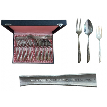 Silver plated William Rogers silverware set composed of 12 forks, 12 spoons and 12 desert forks in a fitted case from E. Chatelain, Lausanne. Good condition with occasional ware. I-II