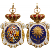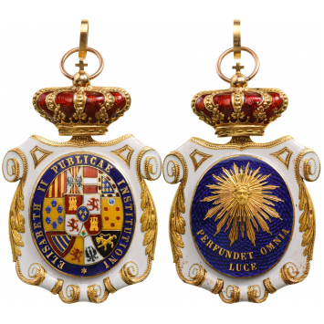 Merit Badge in GOLD and white enamel, 67x43 mm, with chiseled details, oval centre medallion with polychrome arms of Spain, blue enameled outer circlet with inscription "ELISABETH II PUBLICAE INSTITUTIONI", blue enameled reverse medallion with golden beaming sun and the inscription"PERFUNDET OMNIA LUCE", hinged upper crown with red enameled details, round suspension ring and further oval ring. A very rare insignia, excellent condition and quality! I RR!