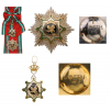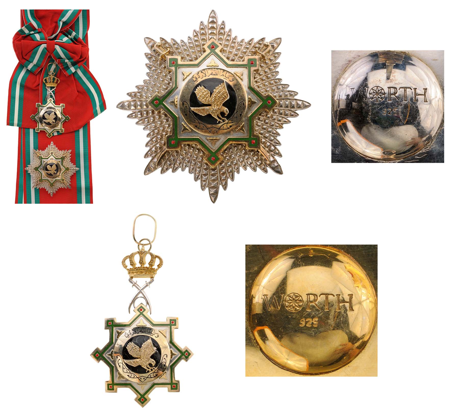 Grand Cross Set of the Order. Sash Badge 94x59 mm, in Silver of geometrical form with green enameled borders and red enameled tips, black enameled centre medallion with golden, flying falcon, within silver outer circlet with black enameled Arab inscription, silver and gilt crown and crossed swords suspension, large ribbon ring, gilt reverse with convex countermedallion, also struck with the maker`s mark of Worth and "925" silver mark, with original sash ribbon. Breast Star 78 mm, in Silver with faceted rays, superimposed centre, similar to the sash badge, added with crossed scimitars, smooth reverse with broad pin and convex counter medallion, struck with the maker`s mark of Worth and "925" silver mark. A very rare set, in extremely fine condition. I RR!