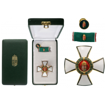 Officer's Cross, instituted in 1991. Breast Badge, 51 mm, gilt Silver, reverse inscription with dates "1946-1991", one side enameled, obverse central medallion gilt, original pin on reverse, with lapel bar and button hole rosette, in case of issue with gilt weapon on the lid. Rare and attractive medal, in mint condition! I R!