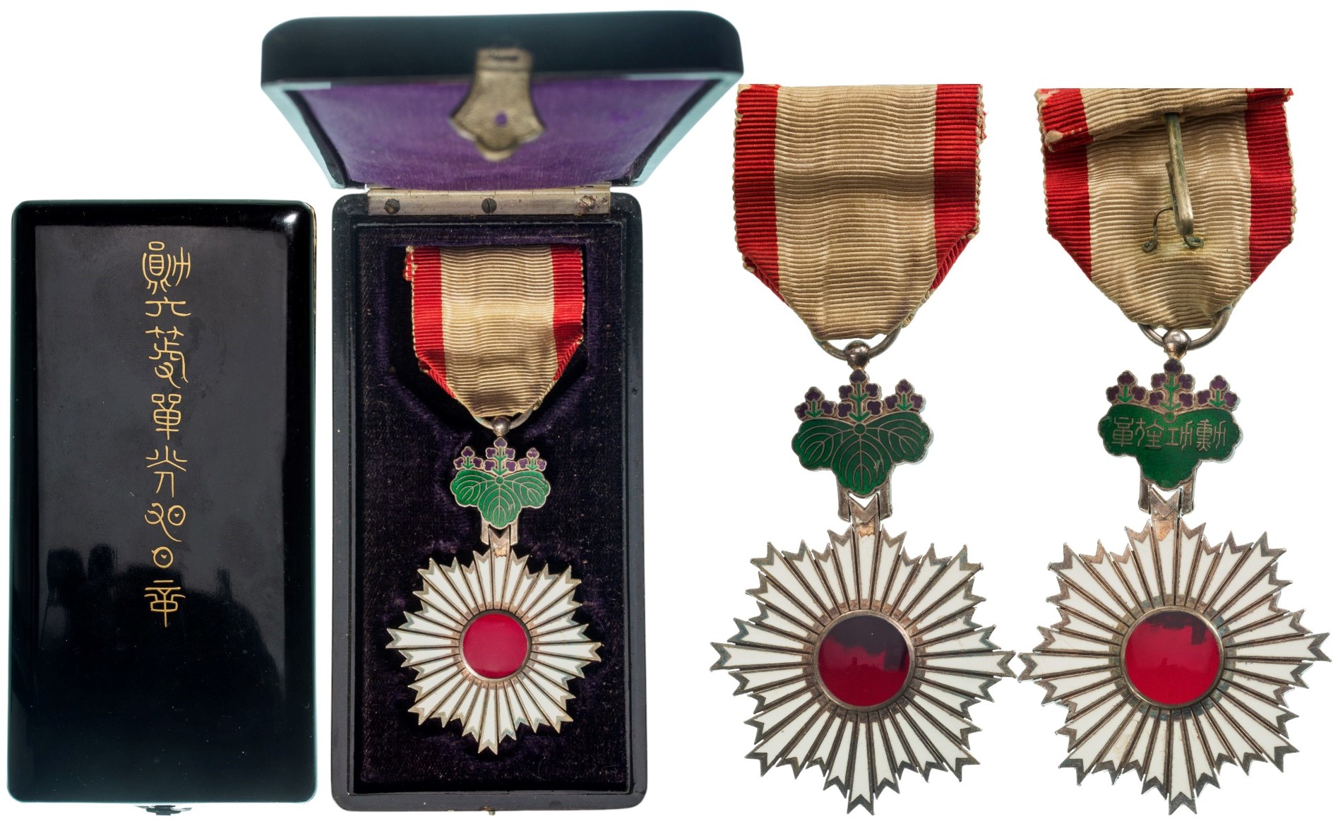 SKU: 590 Auction has finished. Total bids: 0JAPANKnight`s Cross, 5th Class. Breast Badge, 70x45 mm, Silver, both sides enameled, original suspension device and ribbon, in original case of issue. I- Shop ID: SPU 52Auction LXV