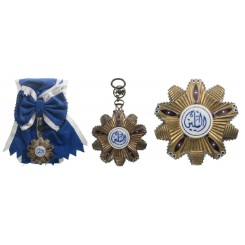 Grand Cross Set, 1st Class, instituted in 1961. Sash Badge, 84x59 mm, gilt Silver, enameled, original suspension device, ring and sash. Breast Star, 103 mm, gilt Silver, multipart construction, superimposed parts gilt, enameled, reverse with long vertical pin. A rare and superb set! I R!