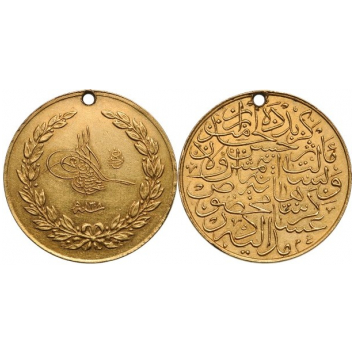 Gold Medal, 23,5 mm., the obverse with the Sultan’s tughra within laurel wreath, the reverse with calligraphic, Arab inscription (“Girid’de ibrâz-I hüsn-I hidmet ve besâlet etmiş olan Asâkir-i şâhâneye mahsûs madalydır), the upper border, pierced for suspension, as usual on Turkish medals.