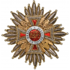 A Prince size embroidered Breast Star of the 1st type, 70 mm., eight-pointed star with rays made of silver strip and wire ending with loops to fasten the decoration to the habit, the arms made of red lacquered silver foil, bordered with silver and golden bullion, flanked by four groups of three Gold oak leaves each, with finely chiseled details, centre medallion with red lacquered ground and applied, chiseled golden monogram “F I A” (Franciscus Imperator Augustus), white enameled outer circlet bearing the Order’s motto “INTEGRITATI ET MERITO” accurately painted in black enamel, the reverse, still preserving the original, protective, paper backing.