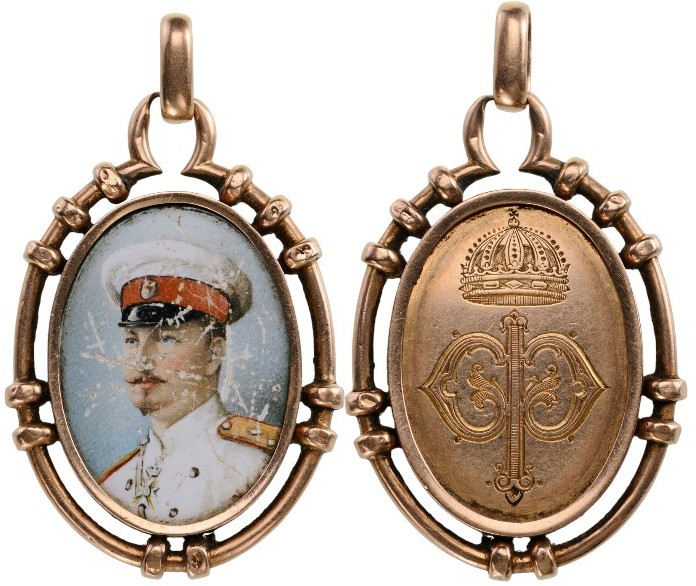 Painted Medallion, 32 x 24 mm., GOLD, with the young Prince wearing the white army field uniform of a General, enclosed in a double, golden oval frame with stylized “knots”, the reverse, with oval, golden plate, engraved with the cyrillic “F” monogram, under Bulgaria’s Princely crown, upper loop and thick, oval suspension ring.