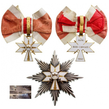 Grand Cross Set of the Military Division. Sash Badge, 60x57 mm, gilt Silver, in the form of a gold-bordered, white enameled trefoil cross, its arms flanked by crossed swords, white enameled centre medallion bearing the golden “Crown of Zvonimir”, white enameled reverse, bearing the Order’s motto “BOG I HRVATI 1076 1941” (God and Croatia), long, ornamented suspension ring and original, short bow. Breast Star, 93 mm, Silver, with polished rays, gilt silver and enameled centre, as the badge’s obverse but smaller, concave reverse, struck with hallmark "800", horizontal pin. A very rare, beautiful set, in excellent condition! I RR!