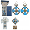 Grand Cross Set, 2nd Model, Civil, instituted in 1935. Sash Badge, 78x56 mm, gilt Silver, maker`s mark "crown-68-48-HW" concave cross, rounded light blue enamel on both sides and laurel wreaths between the limbs. The medallion on the obverse with Romanian coat of arms, the reverse medallion with the inscription Serviciu Credincios (Loyal Service), original sash. Breast Star with crown above the medallion, 55mm, gilt Silver, rhombus shaped, maker's mark "BW, Heinrich Weiss, Bucarest", hallmarked "304-36- crown", superimposed parts, enameled, on the reverse medium pin.In original case of issue by "Heinrich Weis, Bucharest, 100 Calea Victoriei" with monogram of Carol II on the lid, inner fitting missing. Extremely rare set, in very fine condition! Awarded only 35 times! I RR!