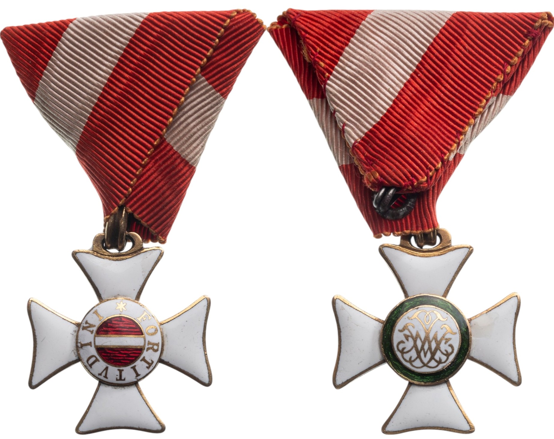Knight’s Cross, 33x30 mm., GOLD, enameled, the obverse centre medallion made of two separate parts, with finest chisel-work under the translucent, bright red enamel, downwardly running Order’s motto “FORTITVDINI” (as on the earliest badges) linked by a six-pointed asterisk, the reverse medallion with golden monogram on a white field within the green enameled outer circlet, finely chiselled with laurel leaves, both medallions, fixed to the cross by means of thin pins passing through the centre body, typical upper loop, with engraved border and closed suspension ring with central groove, triangular ribbon.