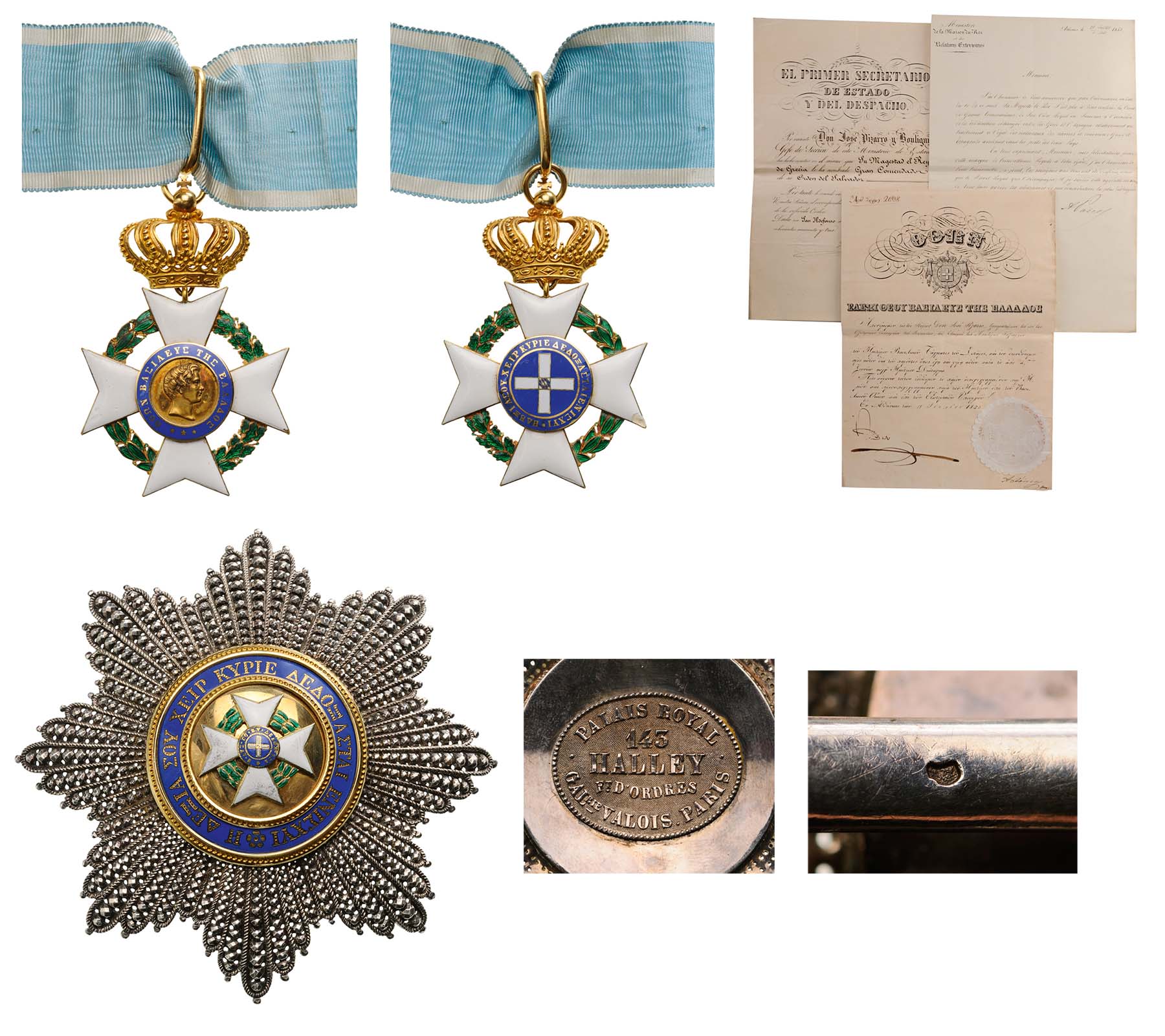 Grand Officer`s Set of the 1st type in GOLD and enamels (minor chips), 69x45 mm, centre medallion with King Otto`s head facing right, and the colours of Bavaria on the reverse`s centre, suspension crown linked to the cross with the typical loop and thin hinge of the Bavarian-made pieces, plain, polished ribbon ring, original neck ribbon. Breast Star, 75 mm, with chiseled and pierced rays, centre medallion in gold, with applied the enameled order`s cross, within blue enameled outer circlet bearing golden, Greek inscription, the reverse, with French marks and the maker`s escutcheon of Halley, Paris, further, the award papers dated July, 1853, to the Spanish gentleman Don Jose Pizarro.A very rare and superb set, very fine condition. II RR!